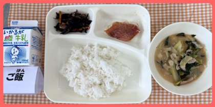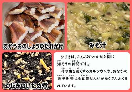 今日の献立は、?あかうおのしょうゆだれかけ・みそ汁・ひじきのいため煮・ごはん・牛乳でした。
