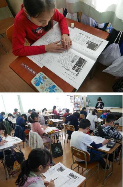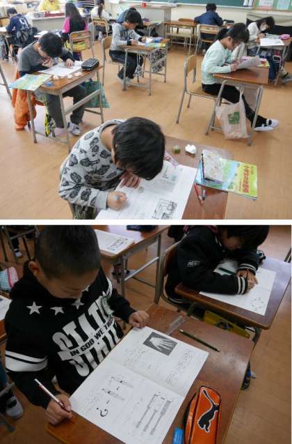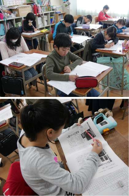5年生、4年生の教室では「しんだん」テストが実施されていました。理科のテスト問題かな、「金環日食 列島興奮」という見出しが・・・理科ではありません国語のテストなんです。最近では新聞などを読んで情報を読み取る問題が増えています。情報を読み取る力が必要なんてす。