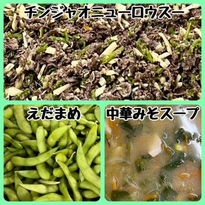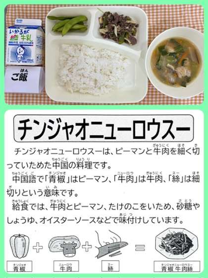 ?今日の献立は、チンジャオニューロウスー・中華みそスープ・えだまめ・ごはん・牛乳でした。