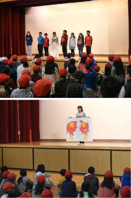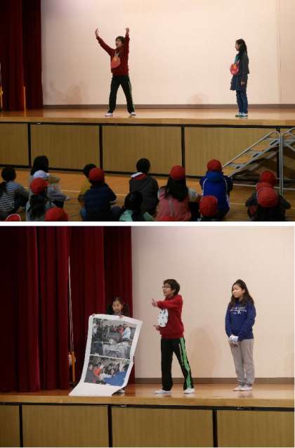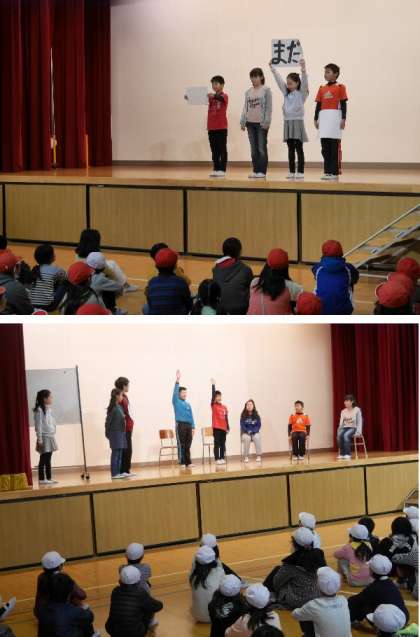 今日の児童集会では、児童会の運営委員会の発表がありました。牛乳パックの回収やあいさつ運動などの活動をコントで楽しく紹介してくれました。