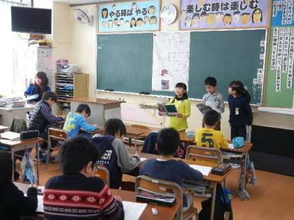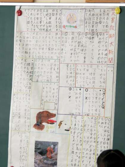 3年国語でははたらく犬について学習しています。自分たちで調べて、大事な言葉や文章を要約してまとめる学習です。要約した文を壁新聞にのせています。今日は教室でできあがった壁新聞で発表をしていました。