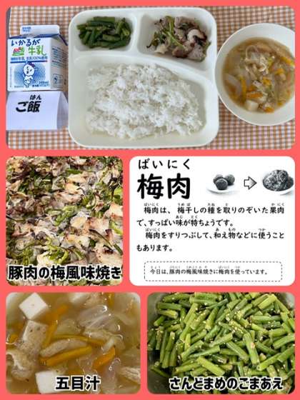 ?今日の献立は、豚肉の梅風味焼き・五目汁・さんどまめのごまあえ・ごはん・牛乳でした。