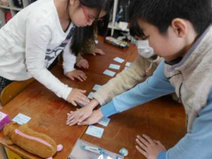 4年生が百人一首の練習をしています。札の取り合いに手がかさなってますね。