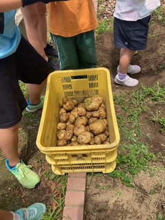 たてわり班のグループでジャガイモ掘りをしました。色んな大きさのジャガイモがたくさん取れました。