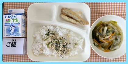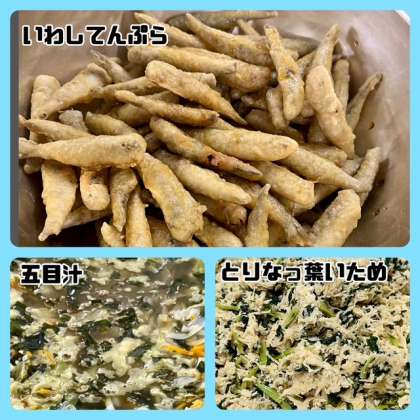 ?今日の献立は、いわしてんぷら五目汁 とりなっ葉いためごはん・牛乳でした。