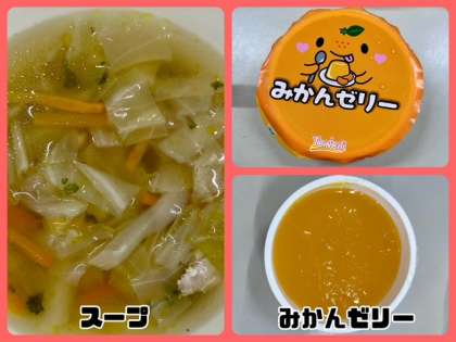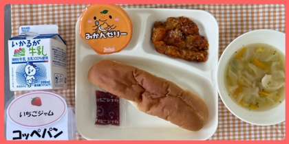?今日の献立は、かぼちゃのミートグラタン・スープ・みかんゼリー・コッペパン・いちごジャム・牛乳でした。