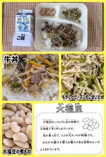 ?今日の献立は、牛丼・もやしとピーマンのごまいため・大福豆(おおふくまめ)の煮もの・牛乳でした。