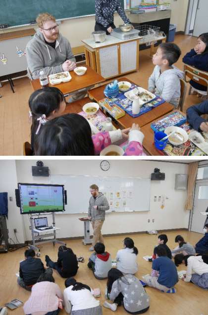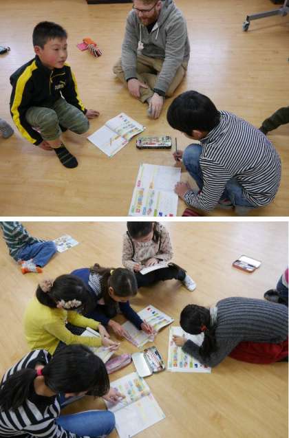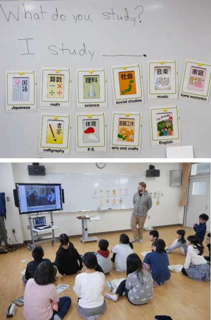 中学校からメイソン先生が来てくれる日です。給食は2年生の教室でたべていただきました。5年生の英語の授業では、「What do you study?」です。いろいろな教科の英語での答え方を学習しました。最後に自分の夢の時間割を作りました。