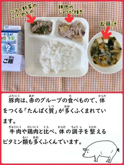 ?今日の献立は、豚肉のしょうが焼き・五目汁・ツナと野菜のいためもの・ごはん・牛乳でした。