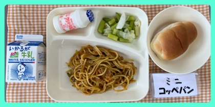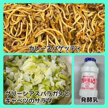 ?今日の献立は、カレースパゲッティ・グリーンアスパラガスとキャベツのサラダ・発酵乳・ミニコッペパン・牛乳でした。