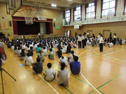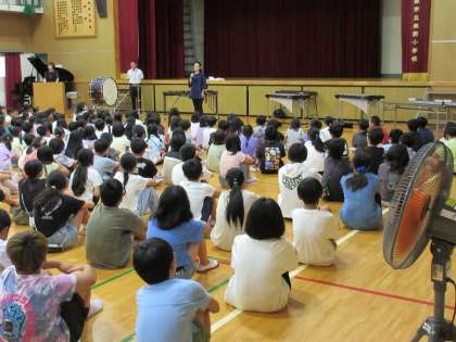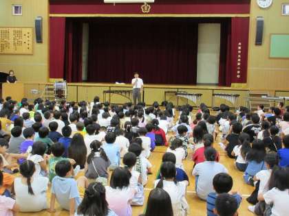 まず、校長先生から「1学期を振り返り、あいさつをしたり、先生の話をよく聞いたりできましたか?」とお話がありました。また、80年前に終戦を迎えた「太平洋戦争」で生き残られた方の話から、今戦争のない時代に生きていることのありがたさや、昔に何が起こっていたのかを知ることの大切さについてもお話をいただきました。
