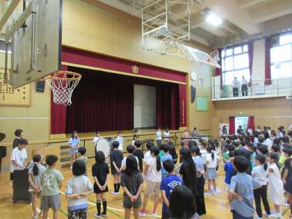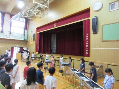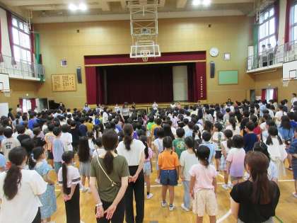 今回は、初めての取り組みとして、ミュージッククラブの児童による校歌の生演奏に合わせて歌いました。素敵な演奏を声に包まれた瞬間でした。1年生も、先日6年生に校歌を教えてもらった成果を発揮していたことと思います。
