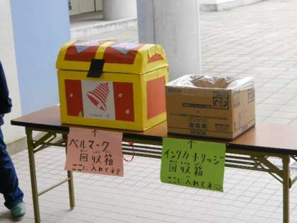 PTAではベルマークを集めています。回収箱は宝箱みたいです。いっぱいになるようにご協力お願いいたします。インクカートリッジも回収しています。
