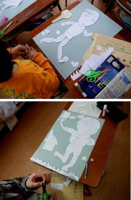 2年生の図工で、紙版画のために、厚紙で凧上げしたり縄跳びする人をつくっていました。どんな版画になるか楽しみですね。
