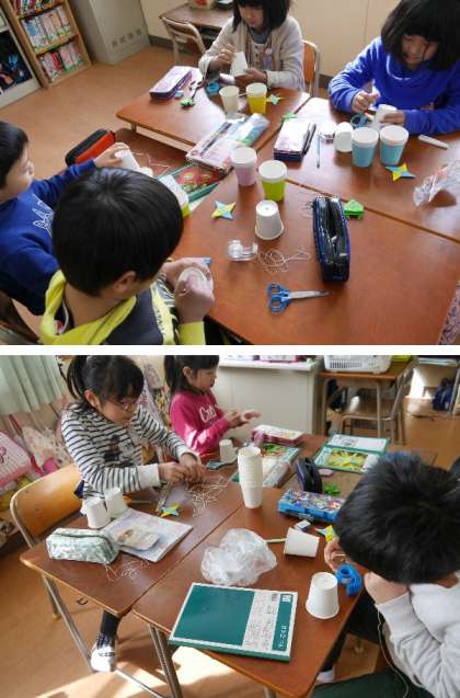 2年生が班に分かれて、それぞれの班がみんなにおもちゃの作り方を教えています。ぴょんびょんがえる、にんじゃしゅりけん、糸電話・・・ちょうど糸電話の作り方をみんなに説明しています。