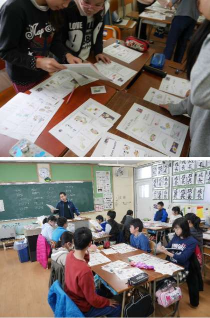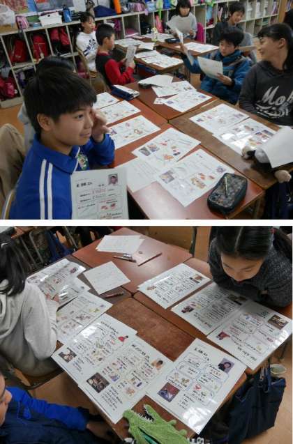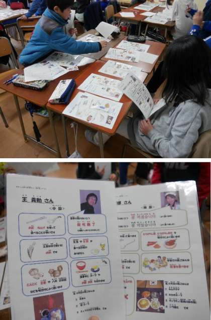 わたしん家の食事から<情報シート>を参考にして、絵カードを並べたり、情報シートに書き込んで、外国の言葉や食事について学習しています。