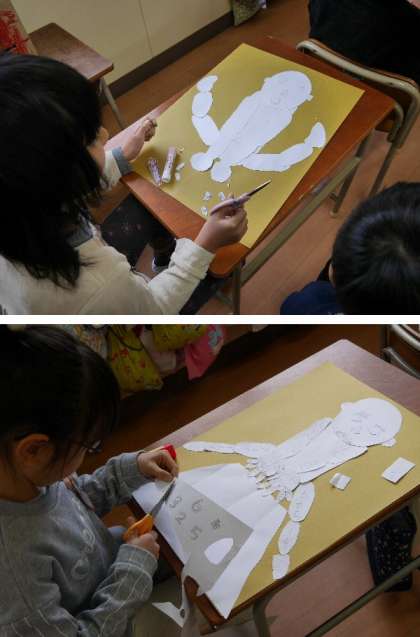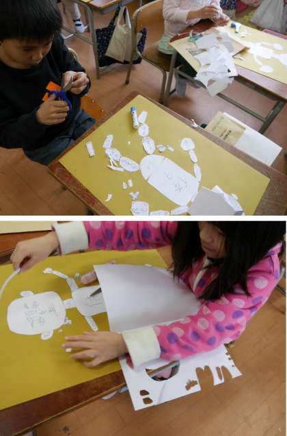 2年生では紙版画をつくっています。1年生の時は顔だけの版画でしたが、2年生では体全体の動きを版画にしています。とびばこを跳んでいる瞬間がよくできていますね。