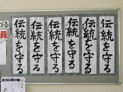 6年の掲示板に書写作品が掲示されました。「伝統を守る」・・・今年の6年生は焼野小学校で1年生から過ごしてきた初めての学年です。しっかりと下級生に6年間の伝統を引き継いでほしいと思います。