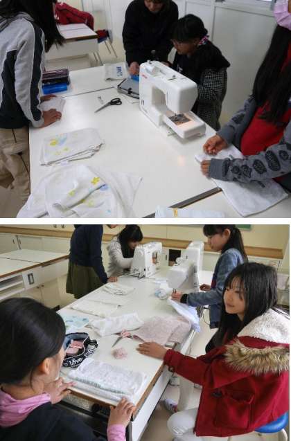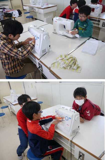 6年生が一生懸命にミシンで何かを作っています。さてなんだろうか?卒業前に感謝をこめて頑張っているようですね。