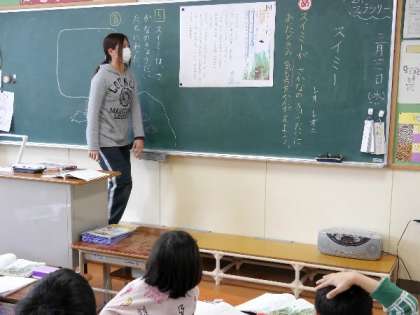 1年国語では「スイミー」を読んで学習しています。スイミーが、さかなの兄弟にあったときの気持ちを考えています。みんなしっかり手をあげてこたえています。