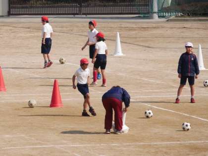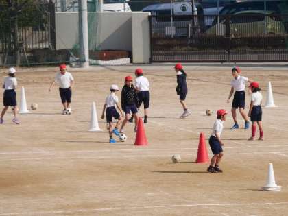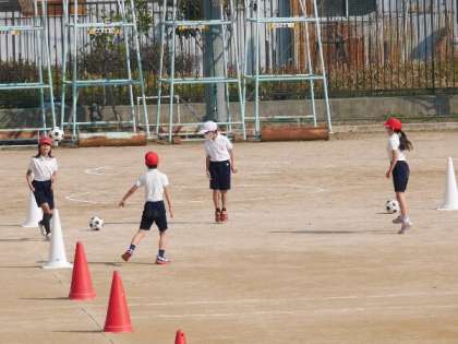 元気よくサッカー4年体育!日差しがあたたかくなってきた