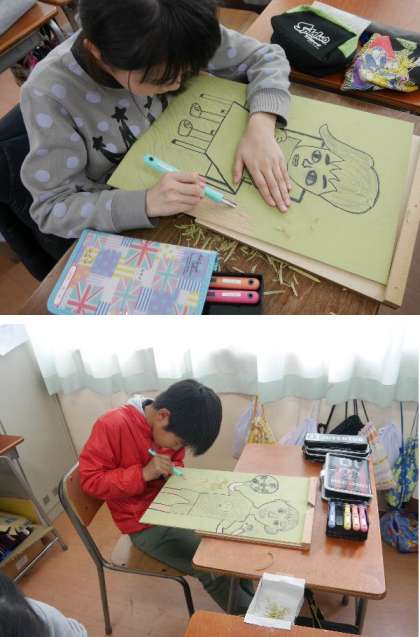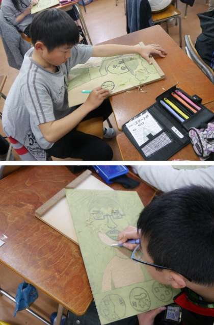 5年生が図工で彫刻刀で版画をほっています。手元にきをつけてくださいね。