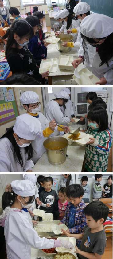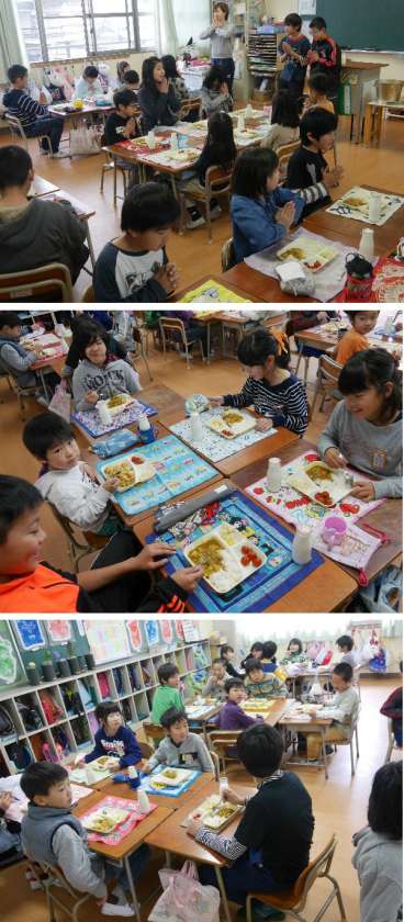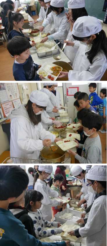 今日はインフルエンザ蔓延で延期になっていた「たてわり交流給食」がありました。各教室に分かれて高学年が給食をいれてくれました。いただきますをして、1年から6年生まで一緒になごやかに給食をいただきました。