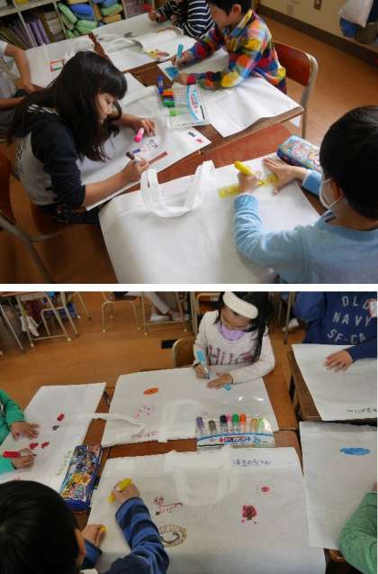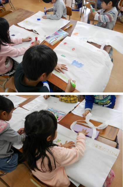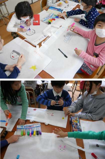 もう少しで1年間が終わりますね。この1年間でたくさんの作品を作ってきました。それらを入れる作品ぶくろに絵や文字を描いて、自分だけのすてきな作品袋を作っています。1年生の作品を袋に入れて家に持ち帰りますよ。