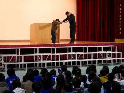 今日の全校朝会で、秋の火災予防運動の防火・防災図画で努力賞をいただいたのでお渡ししました。校長先生からは、1年のまとめとして、学習や生活態度でいい加減になっていることがないか再確認して、4月からの新しい年度にむけてがんばっていきましょう。「ひとつの目覚まし時計」のお話から、よい習慣をみにつけていくことが大切というお話をしました。