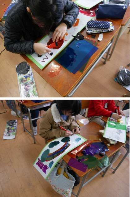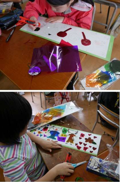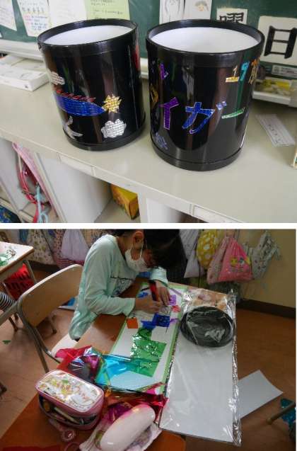 4年の図工で、カッターを使ってカラーシートをはってデザインをしてボックスを完成させます。