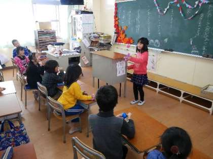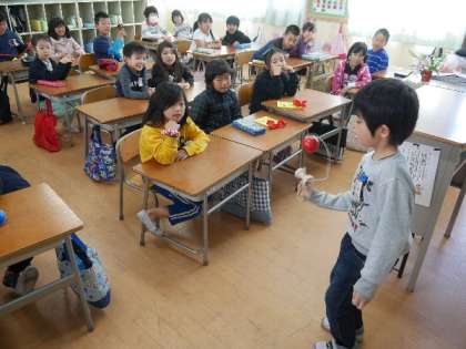 2年生で学期末のお楽しみ会をおこなっていました。得意のけん玉を披露していました。もしもしカメで上手に玉をあやつると拍手がおこります。