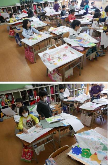 小学校に入学して1年間の学習の成果として、いろいろな作品や文を書いたものを作品袋にまとめています。たくさんの作品がかえされていました。なつかしい作品もありますね。思いでとして大切にとっておいてね。