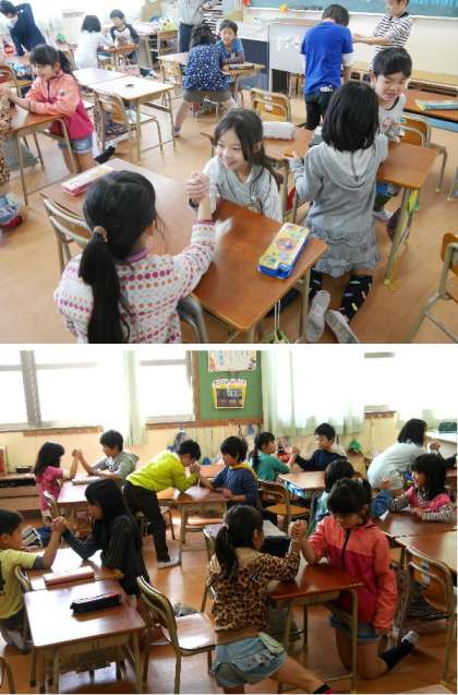 2年生のお楽しみ会では、全員のトーナメントによるうで相撲大会が行われていました。力がはいっていますね。