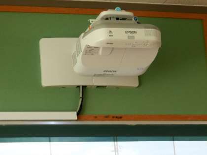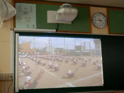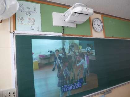 5・6年の各教室に、超短焦点プロジェクターを設置しました。黒板の上から投影するので、コードがからんだりすることもなく、とても便利になりました。DVDやビデオ、パソコン、タブレットもすぐにつながります。授業などいろいろな場面で活用できます。今後、中学年や低学年の教室にも設置していきます。