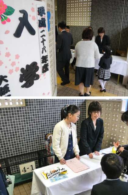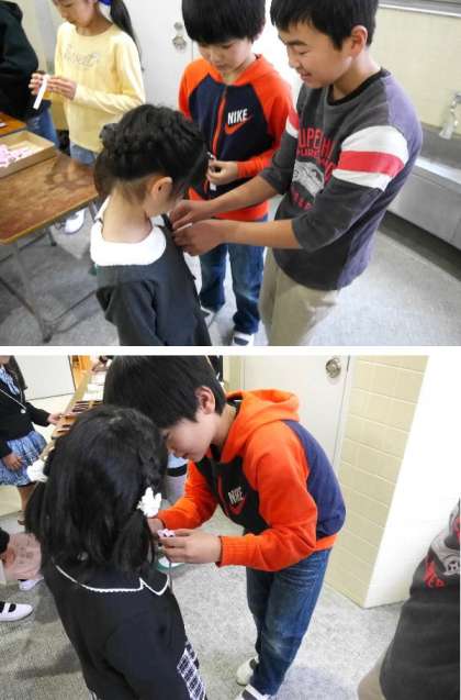 受付では、新6年生が担当し、名札やお祝いの花飾りを胸につけてくれています。