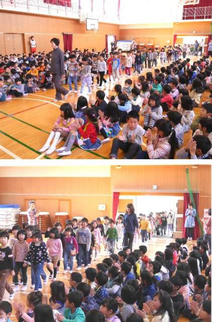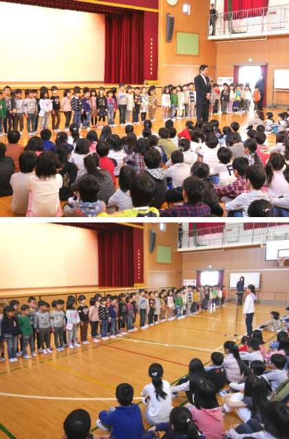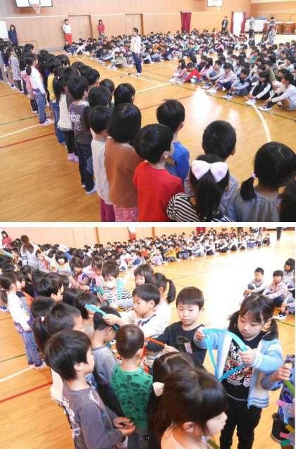 今日は、1年生が2年〜6年生と初めて対面しました。皆が待っている中を1年生が入場してきました。校長先生からの挨拶のあと、6年生の代表児童が歓迎のあいさつをしてくれました。2年生が手作りのメダルをかけて歓迎しました。
