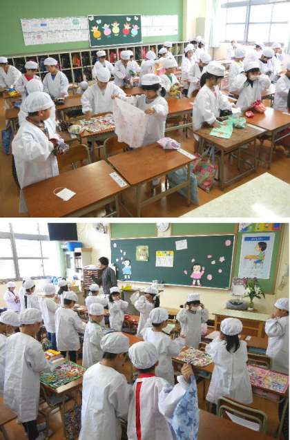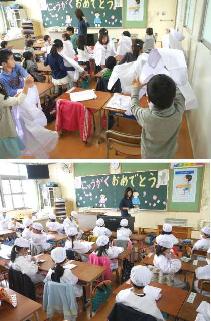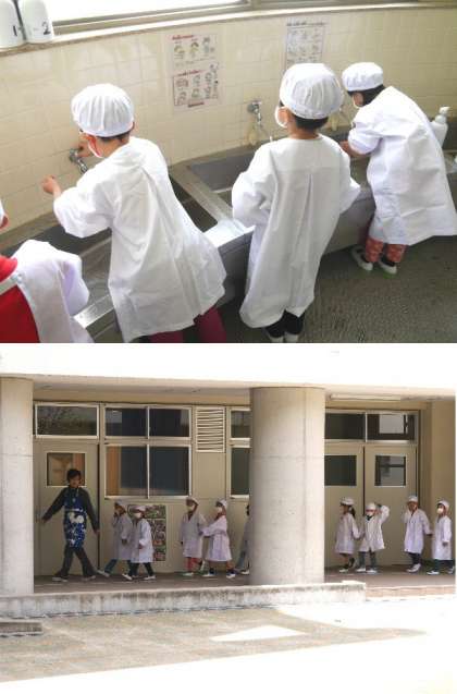 今日から給食がさっそく始まります。初めての小学校での給食なので、1年生は給食着を着る練習をしてしっかり準備をしていました。手を洗って、給食係が給食室へ出発です。
