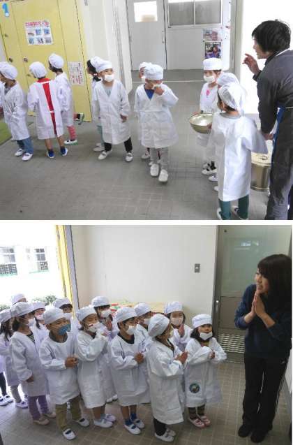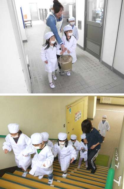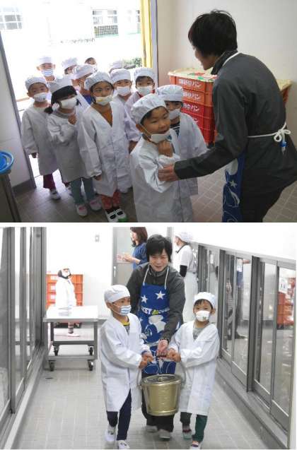 1年生の給食係が給食室に給食をとりにきました。給食室に入って元気よく「いただきます」をして、給食を運びます。だいじょうぶんな?気を付けてお願いします。
