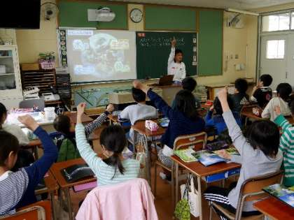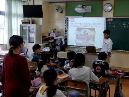 高学年の理科の授業が始まりました。教室に設置された超短焦点プロジェクタと新しい授業用パソコンを使って、プレゼンで授業を進めています。映像での授業はわかりやすいですね。