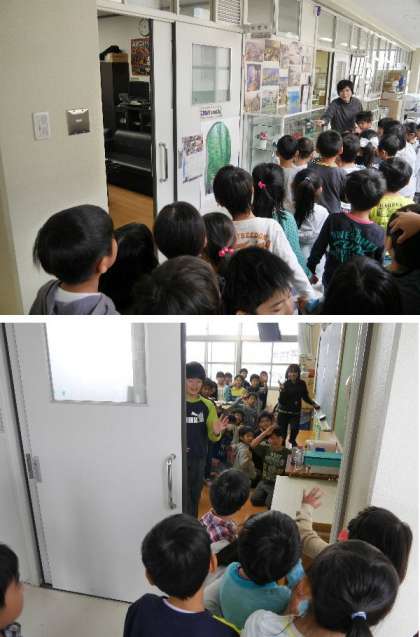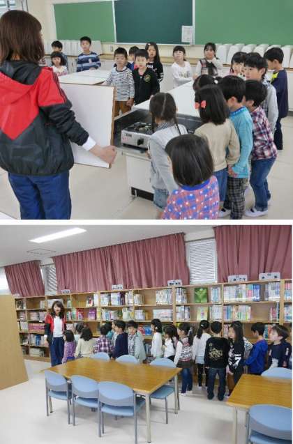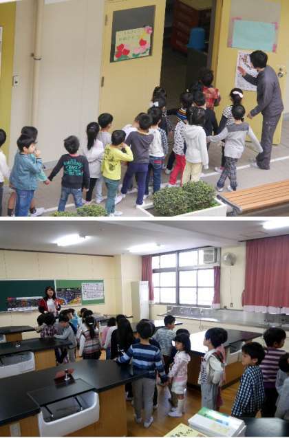 1年生は校内の見学をしました。担任の先生からやさしく説明してくれましたね。校長室、職員室、図書室、給食室、理科室などをまわりました。高学年の教室では、おにいさん、おねえさんたちが手をふって歓迎してくれましたね。うれしいですね。