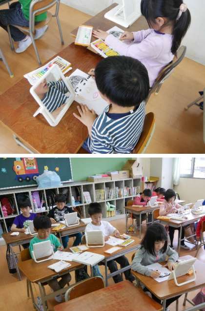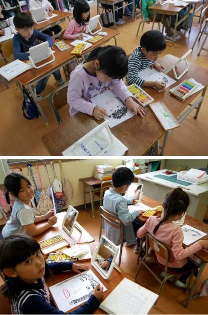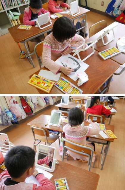 2年生がカガミとにらめっこ。自画像を細かく描いています。じょうずに描けたかな。