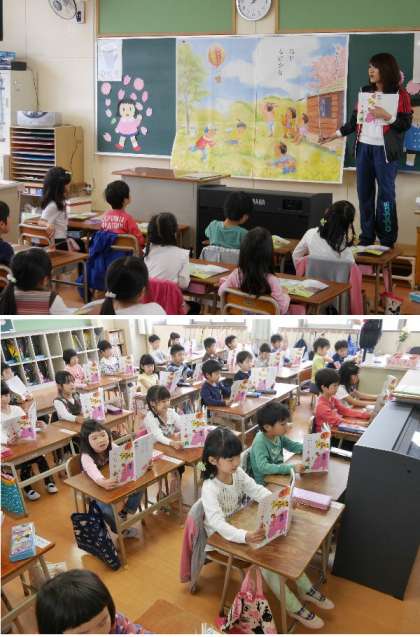 1年生の国語の授業かが始まりました。教科書を大型プリンターでカラー拡大した掲示物をつかって学習していました。カラーはインパクトがありますね。感性ゆたかな心が育つことをねがっています。
