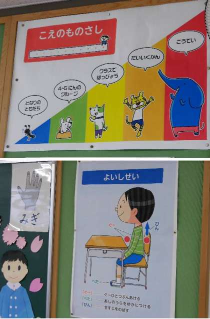 また、引きだしのお道具箱の中身を確認したりしていました。たくさん覚えたりすることがありますね。教室には、よい姿勢の座り方や声のものさしが掲示されています。場面にあわせて声の大きさも考えることが大切です。