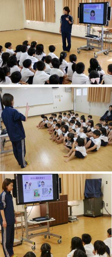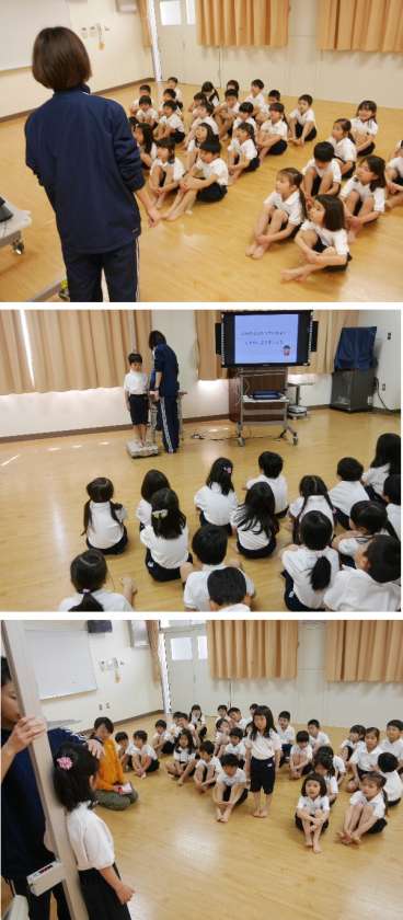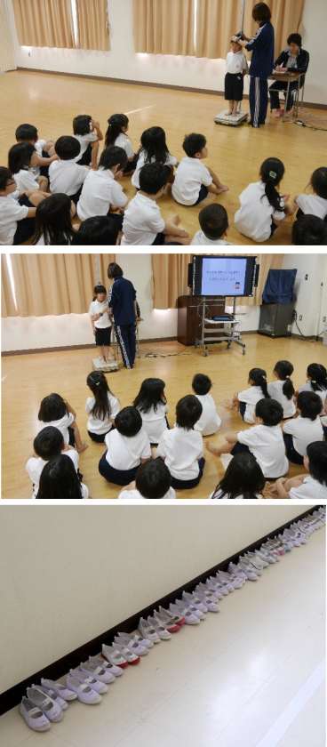 はじめて発育測定をする1年生です。保健室の先生から、自己紹介と保健室の使い方についてお話がありました。身長と体重をはかりました。これからの1年でどれだけ成長するか楽しみですね。