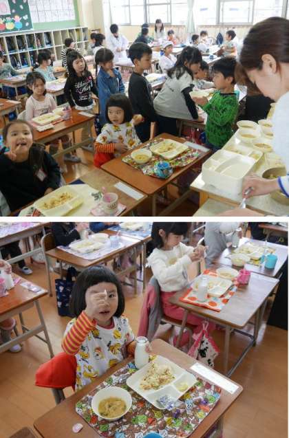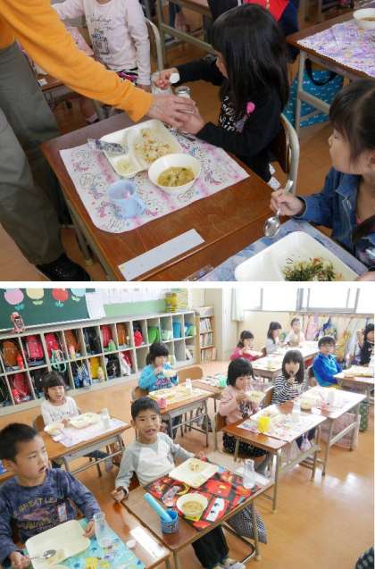 今日の給食のメニューは、かやくご飯とみそ汁、焼きじゃが、牛乳です。とてもおいしかったですね。おかわりする子もたくさんいました。1年生が給食でむずかしいのは、牛乳のフタをあけることです。少しずつ自分で開けられるようになっていきましょう。