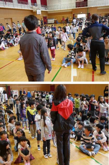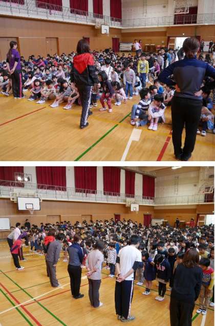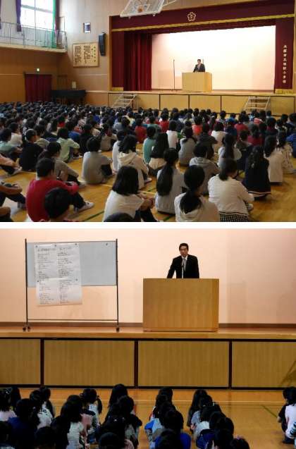 1年生が初めて全校朝会で整列しました。全児童がそろっての全校朝会になりました。校長先生から、サトウハチローさんの「美しく自分を染めあげてください」という詩を読みました。