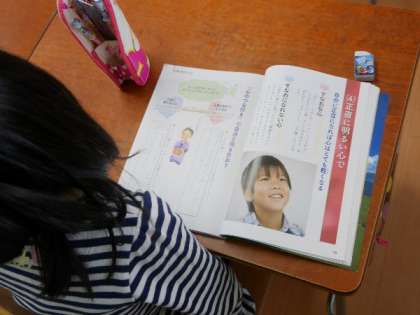 4年生の道徳の授業です。ボール投げで窓ガラスを割ってしまって、正直に言おうとする心、言えない心があります。「心のつなひき」で自分と向き合うことが大切です。皆からいろいろな意見がとびだしました。すなおな心について考えてみましょう。