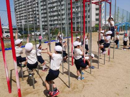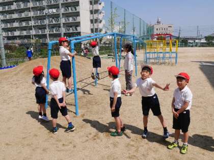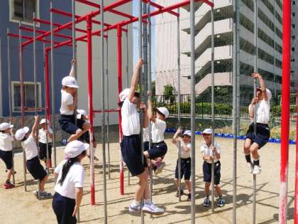 2年生がのぼり棒にチャレンジしています。なかなか上までいけませんね。手の力だけではむずかしいので、足を上手に使う必要がありますね。