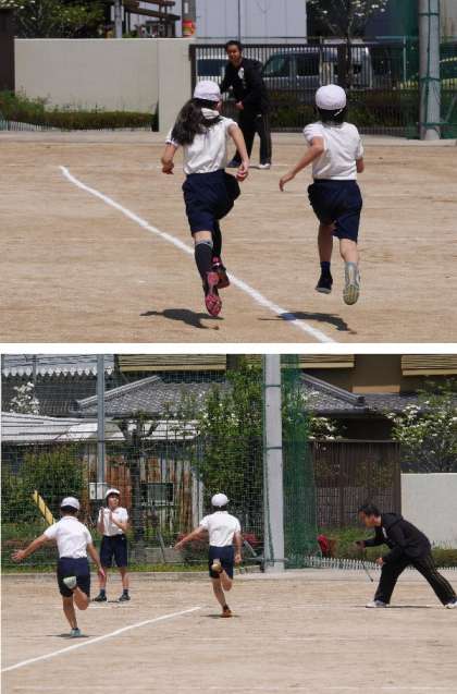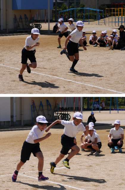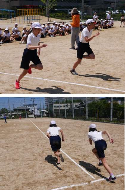 6年生が運動場で、50m走の練習をしています。先生がタイムを測ってくれています。去年より早くなったかな。ゴールでスピードを落としてしまう人がいます。ゴールは最高スピードで走り抜けないとタイムがよくなりません。力の限りがんばりましょう。