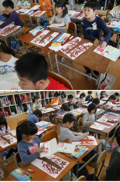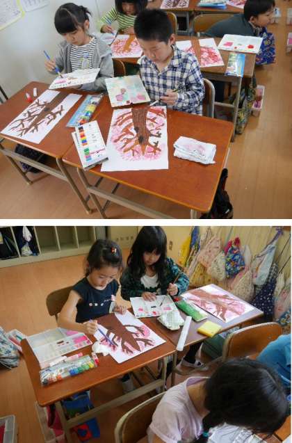 3年生が描いているのは、いろいろな桜の木ですね。桃色の花びらがとてもきれいですね。クレパスで木の幹を描いて、花びらは水彩絵の具で鮮やかに描いています。とてもいい感じです。